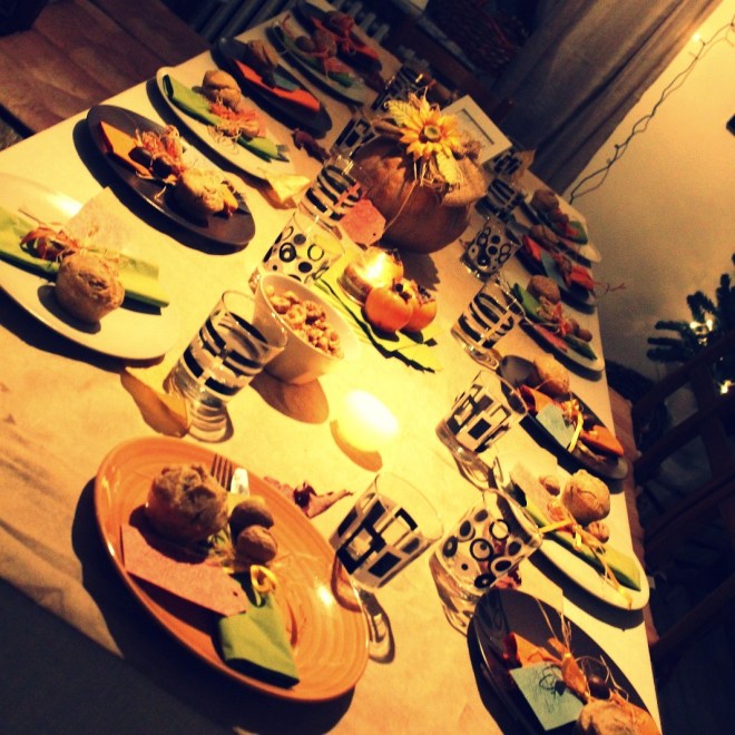 Ogni occasione é buona per stare insieme! La scorsa settimana per esempio ci siamo ritrovati seduti dietro ad una tavola imbandita e decorata accuratamente per festeggiare una festivitá lontana dai nostri costumi quanto profonda e ricca di spunti di rifressione: Il giorno del ringraziamento.